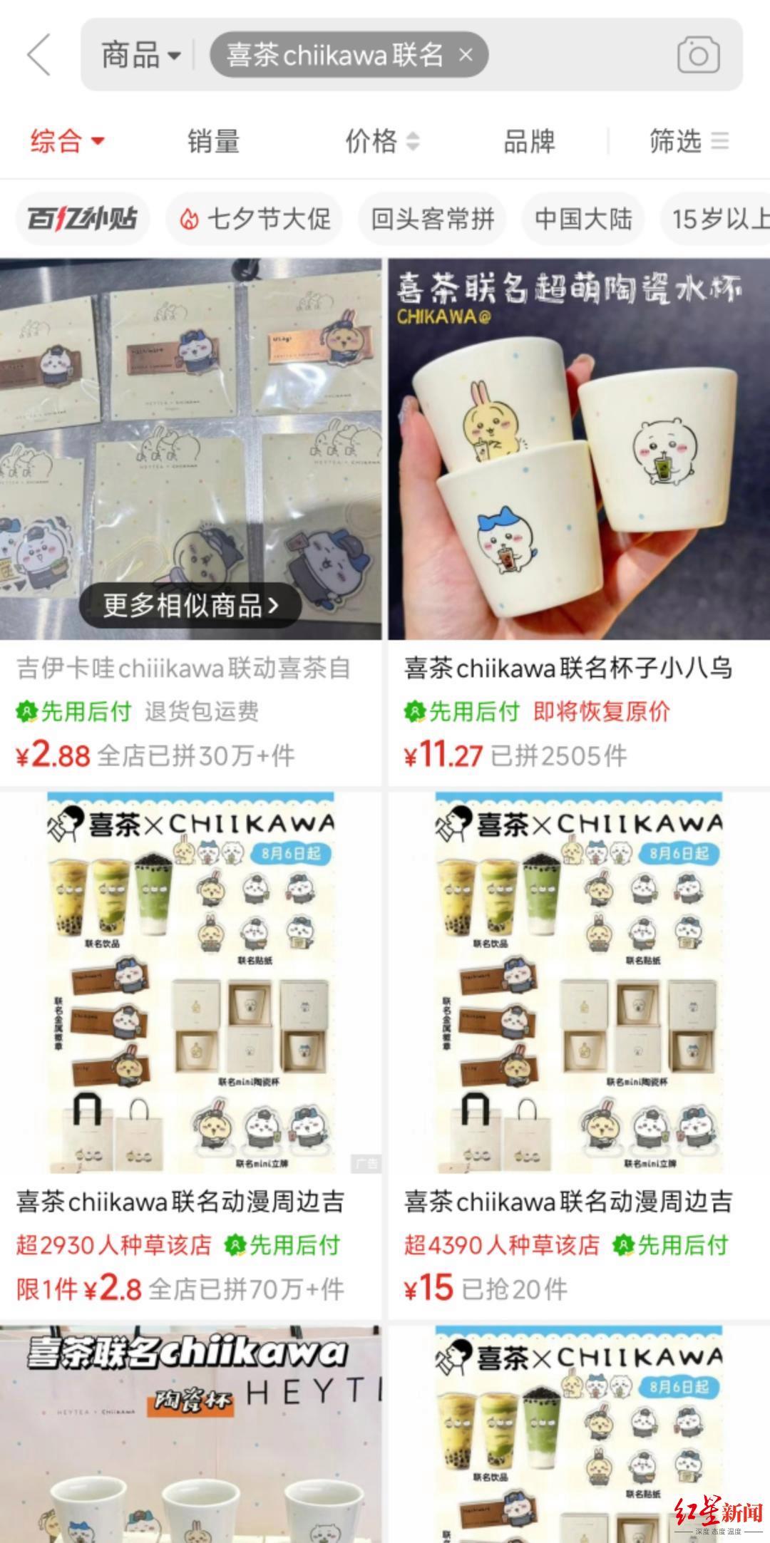 奶茶周边的火爆,也催生了自制周边的销售。目前,在拼多多平台,有部分卖家开始“预售”喜茶 CHIIKAWA联名主题的纪念品。其中一款“喜茶徽章+立牌”套装包邮价8.88元,最晚8月30日发货,店铺客服明确表示“产品是自制的,介意慎拍”,目前该产品已售出56件。