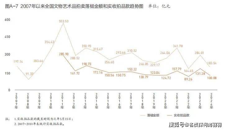 2024年,受经济等不确定性因素影响,全国文物艺术品拍卖落槌金额为183.54亿元(不含买方佣金),同比下降了35.38%。全年拍卖成交量为 30.71 万件(套),较上年减少了10.35%。文物艺术品拍卖市场进入深度调整期。截至2025年5月,完成结算100.08亿元(另实收买卖双方佣金15亿元)。