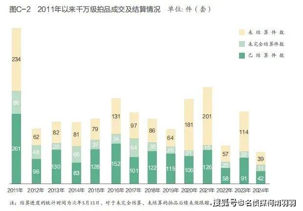 2024年,千万元以上文物艺术品成交总量出现下降,共成交92件,比上年减少135件。截至统计时,有42件完成结算,11件未完全结算。