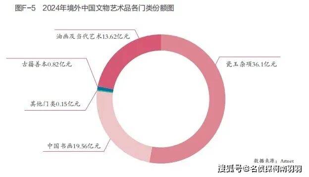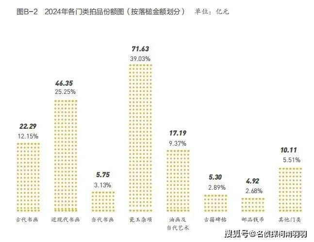 在中国境外,瓷玉杂项仍是表现最佳的门类。该板块的上拍数和成交数量虽然有所下跌,其成交总额却达到 36.1亿元(含买方佣金),占 2024 年中国境外总成交额的 51.39%。中国书画板块波动较大,高价拍品由42 件跌至18 件;油画及当代艺术同比下跌 27.59%;古籍善本板块成绩亮眼,凭借两件千万级作品逆市上升,同比急升 95.24%。