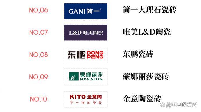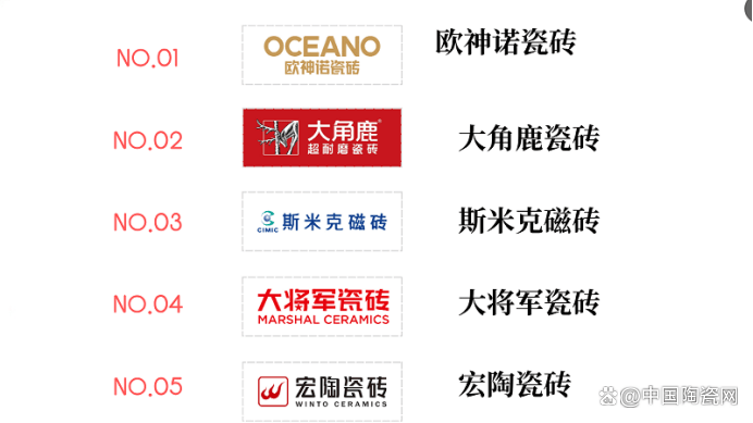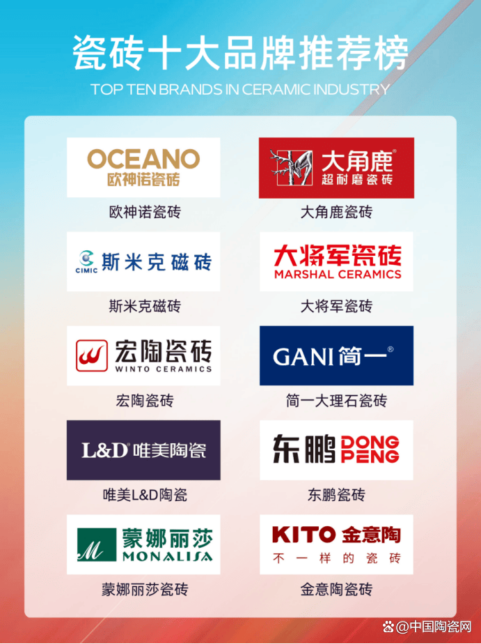 2025瓷砖十大品牌榜单:欧神诺瓷砖、大角鹿瓷砖、斯米克磁砖岩板、大将军瓷砖、宏陶瓷砖、GANI简一、唯美L&D陶瓷·岩板、东鹏瓷砖、蒙娜丽莎瓷砖、金意陶瓷砖。