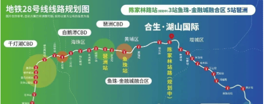 公共交通方面,项目周边规划有地铁28号线陈家林路站,根据规划,该站点距离项目仅900米左右(目前规划站点位于合生湖山国际附近,具置与开通时间存在一定不确定性)。地铁28号线作为广州的快速地铁线路,建成开通后,将极大缩短项目与天河、海珠、黄埔等区域的出行时间,为依赖公共交通通勤的业主提供更高效的出行选择。此外,项目5公里内可达地铁13号线沙村站,从该站点出发,4站即可到达黄埔区,进一步丰富了业主的公共交通出行方式。