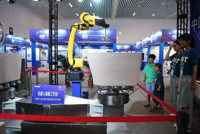 9月16日,参观者在第二十四届唐山中国陶瓷博览会现场参观一款机器人施釉工作站。新华社记者 牟宇 摄